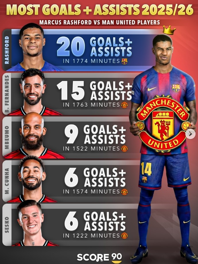 1月23日讯 本赛季曼联外租巴萨的前锋拉什福德发挥出色,各项赛事1774分钟出场已经直接参与20粒进球(8球12助)。