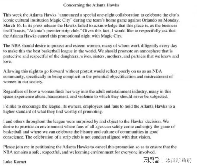 科内特觉得,为一个脱衣舞俱乐部做推广,这和NBA联盟一直以来树立的形象完全不符,还可能会涉及到“物化和虐待女性”这样严重的问题。可老鹰队这边呢,直接单方面拒绝了和科内特的讨论,态度那叫一个强硬。很多球迷可能也会觉得纳闷儿,怎么NBA这种充满热血与激情的体育类赛事,突然就把脱衣舞俱乐部的联动明目张胆地摆到台面上来了呢?
